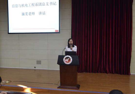 会议上,团办主任林海鑫同学向大家介绍了本次会议的流程,紧接着,系团总支书记施雯老师及第十届员工分会主席葛文倩同学分别上台讲话,她们对新干事的加入表示欢迎,强调了作为干事应该具备的素质,并就本学期系部的团学工作提出了相应的要求和建议。