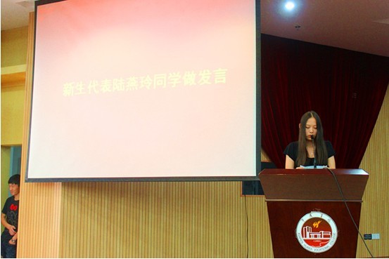其后,我系在校生代表陈思同学及3013级新生代表陆燕玲同学也分别在典礼上进行了发言。在校生代表陈思同学与新生们分享了在华厦的生活经验,并用其亲身经历鼓励新生努力学习,奋勇向前;新生代表陆燕玲同学则表示,将始终保持昂扬向上的精神状态,全身心投入新的学习生活中,努力学习,回报母校的培养。
