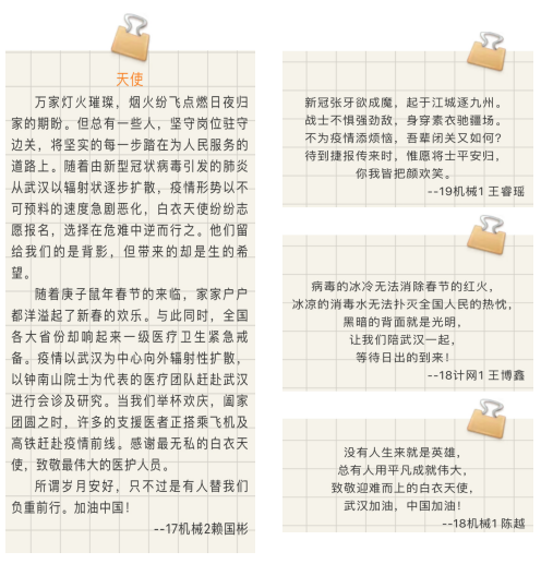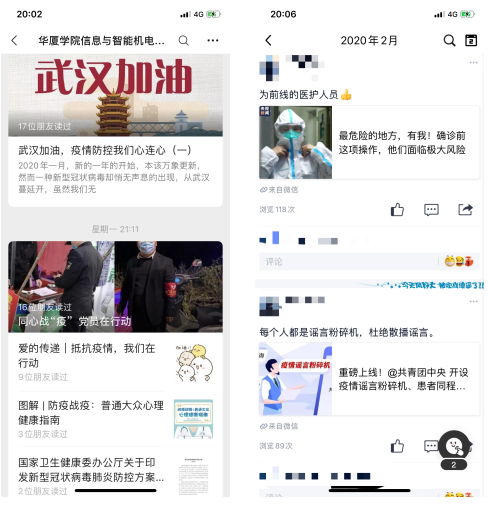 在疫情防控的关键时期,在校团委的号召下,公司团总支积极响应,成立由范晓宇老师担任第二支队队长的10人疫情防控青年突击(预备)队,参加抗击疫情的相关工作,疫情防控青年突击(预备)队利用公司公众号宣传平台发起《“众志成城,共抗疫情”全体师生倡议书》,及时、准确、客观的推送传染病防治法和防控知识的宣传教育,提高大家的自我防护能力。同时,疫情防控青年突击(预备)队成员在家中坚持每天在微信朋友圈、QQ空间等社交平台宣传疫情防控相关知识,对身边存在的造谣、传谣行为及时进行制止,加强舆论引导,截至2月12日,突击队累计转发抗疫情相关内容近500余次。在此期间,团总支宣传部、学习部、组织部以及文娱部联合开展“战疫情,书写诚挚祝福渡难关”、“在行动,记录铿锵口号送祝福”主题活动,在线征集到防控疫情的征文236篇、祝福语201条、祝福视频作品22份,同学们用温暖人心的话语,抒发出对“逆行者”的赞美,对患难同胞们的鼓舞,彰显了华厦学子的温情。