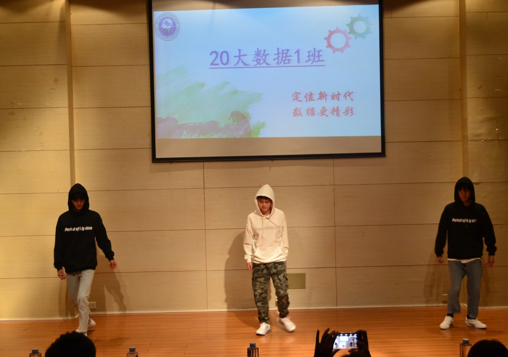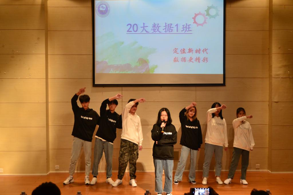 班徽中设计了以“数据链”为背景的“读书人”,并且在蓝色圈环上附上了他们的口号:“信心、决心、专心、恒心”。班服背面融入了著名的“博弈论”元素,他们还通过富有创意的小视频介绍了班服设计的想法与构思。接着,他们通过走秀以及歌唱表演展现了他们班班服的独特。