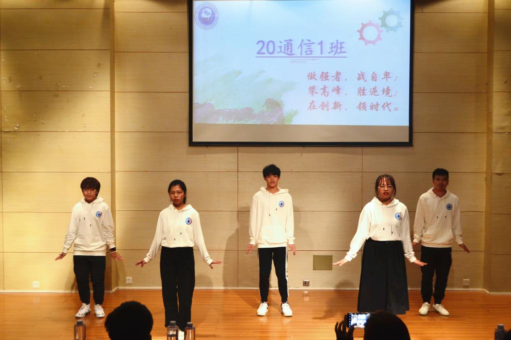 班徽是由地球、通信网络、文字等元素组成,其中“i”代表着information(信息),且其形似“人”。另外左边的“蓝色”炫光代表男生,右边的“粉色”炫光代表女生,两边向中间融合,体现出了“团结”的精神!他们班级的讲解很活跃,能够掌控全场,并且表演欢快,充满了青春的活力!