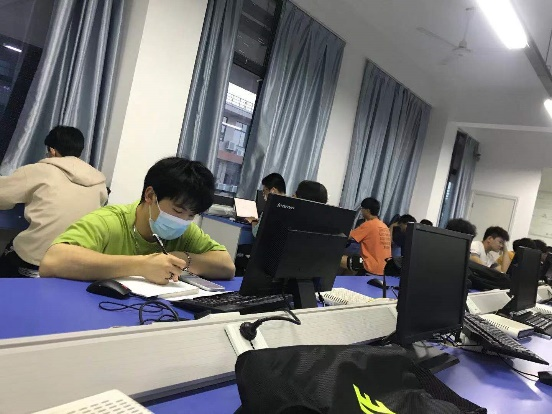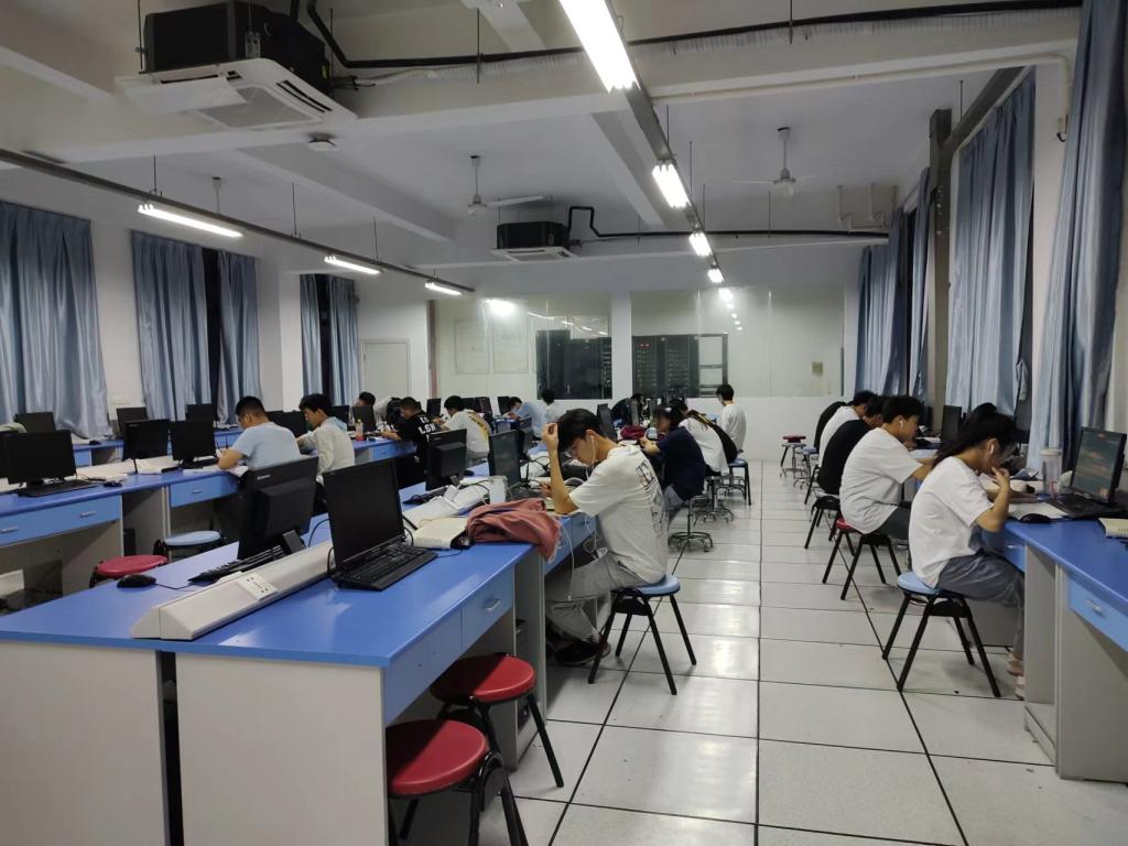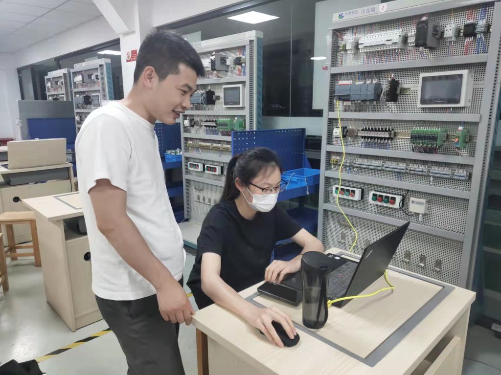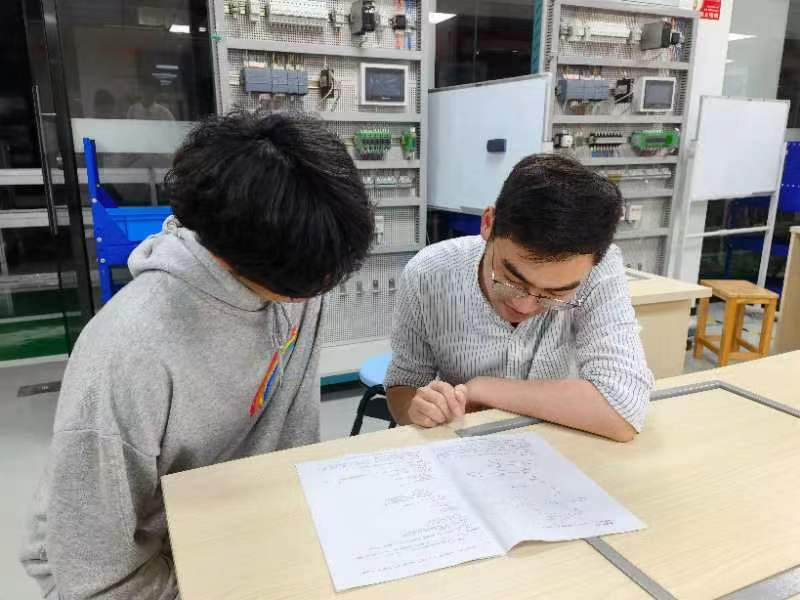 谭文奇老师,林贵堃老师指导部分2020级机器人班级的员工习题解答以及可编程控制器的相关实验操作,员工积极性较高,气氛良好。