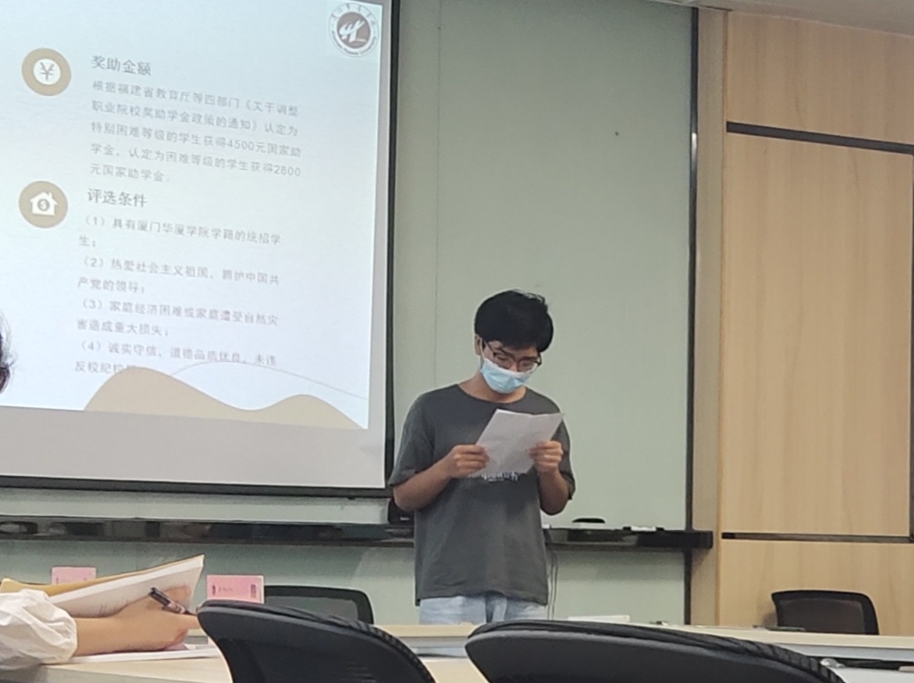 其次,由2021级数据科学与大数据技术1班陈任强同学诵读《伟德体育员工手册》中国家奖助学金评选相关要求,深化各位员工对评选要求的了解程度,严格规范评选、监督流程。