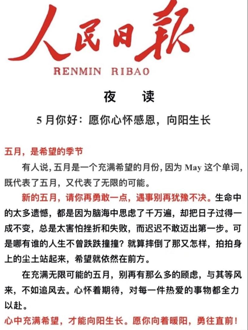 随后,由练小慧老师与同学们共同学习了人民日报5月感恩内容,希望大家戒骄戒满,默默耕耘,心怀感恩,向阳生长。