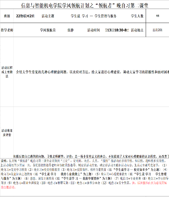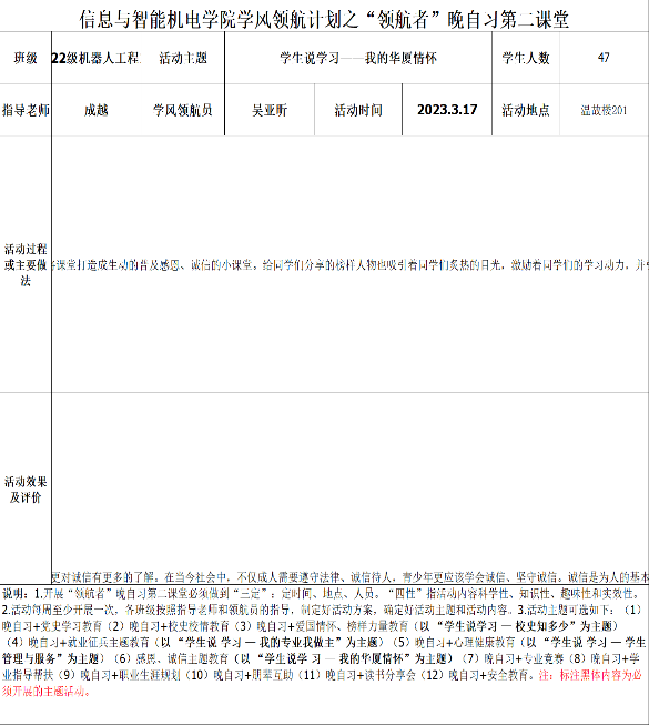 22机器人1班和22物联网2班分别开展了“员工说学习——我的华厦情怀”和“员工说学习——员工管理与服务”主题活动。绝大部分同学无玩手机、吃零食、睡觉等违背课堂纪律的现象,大多数同学都能做到提前进入教室,快速进入学习状态,严于律己,努力钻研问题,无迟到早退现象,每个人都全身心的投入到学习的氛围中去,致使学习氛围浓厚,学风良好,大部分同学都专心投身于班会。