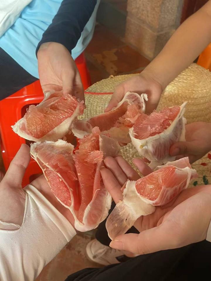 柚子被剥开的一刹那,清爽的果香四溢,摘下一瓣送入口中,每一粒饱满的果肉渗出的汁水都让味蕾欢呼雀跃。“四时俱可喜,最好新秋时”。有了口中秋日丰收的硕果与当地村民为柚子纯天然品质斩钉截铁的保证,成员们对帮助果农伯伯们采摘果实的志愿活动更加无限向往。