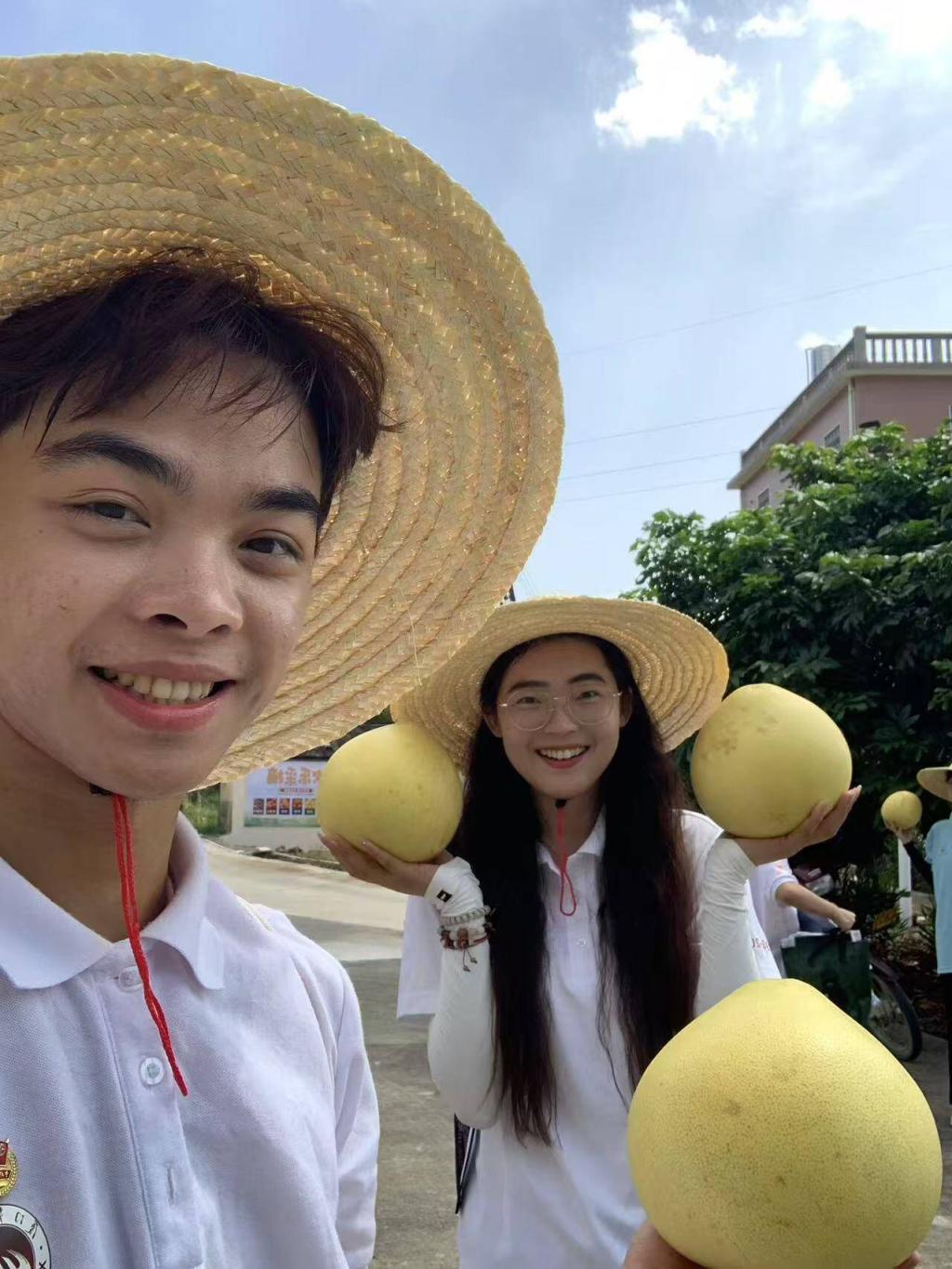柚子沉甸甸地垂在树枝上,实践队成员们在陈书记和果农们的带领下,顶着烈日深入田间地头,帮助们摘下一颗颗精挑细选的柚子,在不知不觉的志愿服务中大汗淋漓。阳光透过树叶的缝隙,洒在蜜柚上,每当一个蜜柚落入袋中,都伴随着一阵清脆的声响。一阵阵凉风掠过,掠过绿意盎然的叶片,掠过清新的柚香,也掠过实践队队员们忙碌的的身影与汗水。