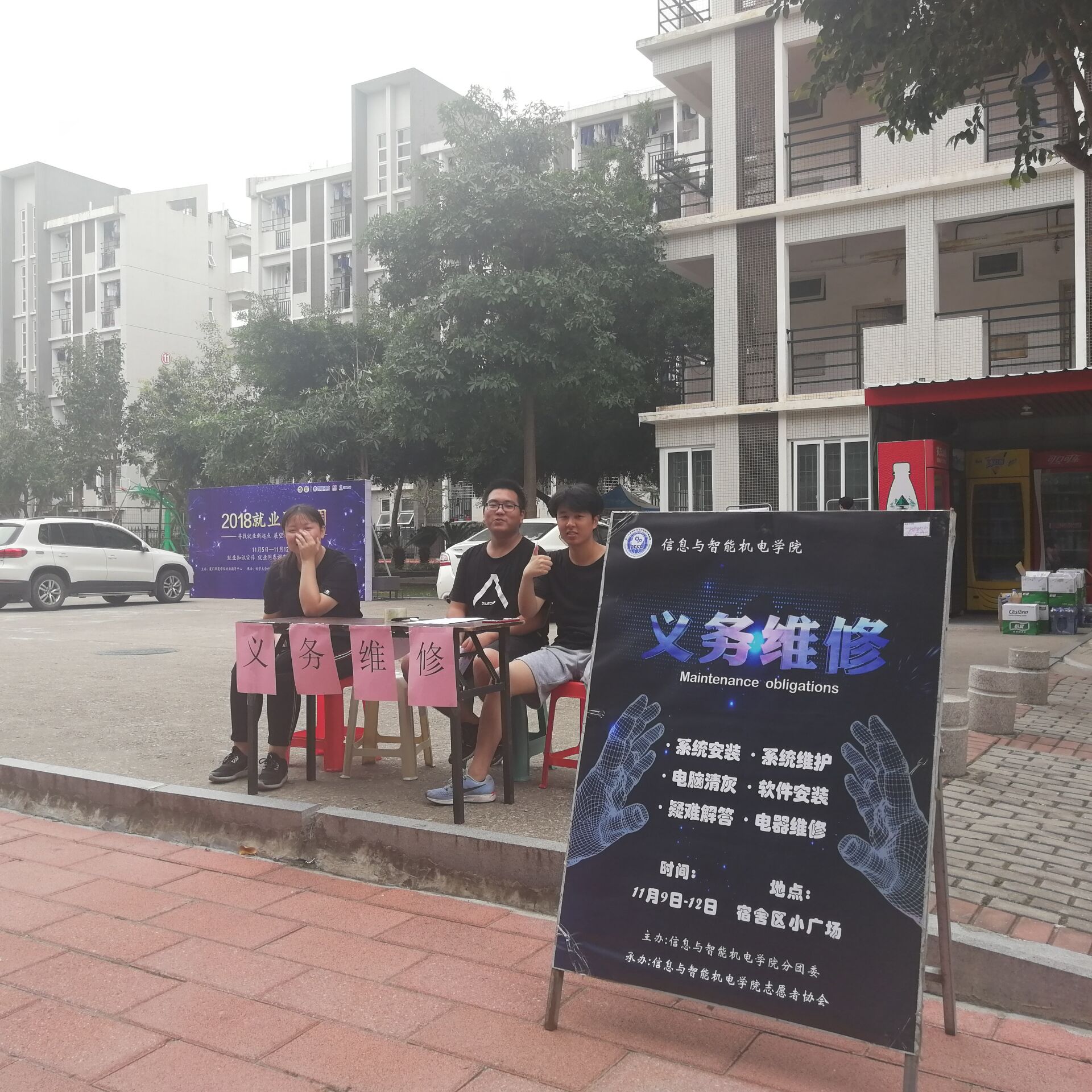 公司义务维修活动是结合自身专业特色、通过自己所学的技能,为同学们解决在电脑方面遇到的各种疑难问题。在这次活动中,同学们发扬不怕苦、不怕累的精神,顺利的完成了义务维修的活动任务。