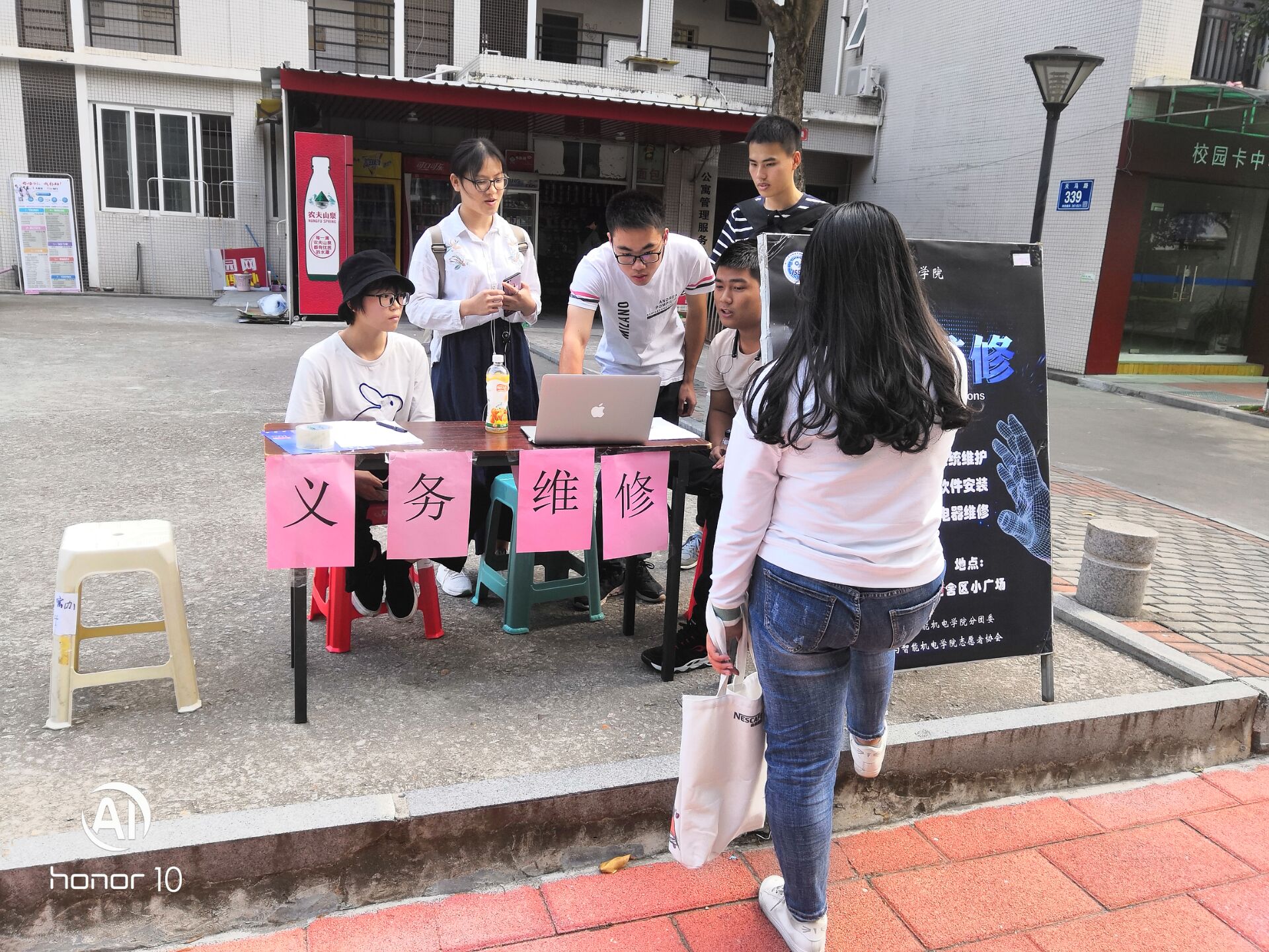此次义务维修主要服务项目为:解决电脑卡慢问题、死机蓝屏问题和网络问题。在活动一开始就吸引很多同学前来询问。随着时间的推移,活动现场气氛越来越热闹,维修员们都忙的不亦乐乎。他们在各自的战场上,挥洒着热情、倾注着努力。更有部分干事废寝忘食,即使到了换班的时间也依旧在摊位前帮忙。为了防止带过来维修的电脑再次出现相同的问题,干事们都会对同学们出现的电脑问题进行解释。