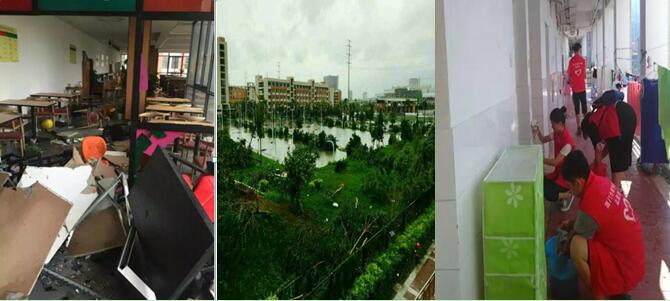 图为班会PPT中的一些台风过后的图片和我们可爱的志愿正在积极还校园一份美丽时的图片