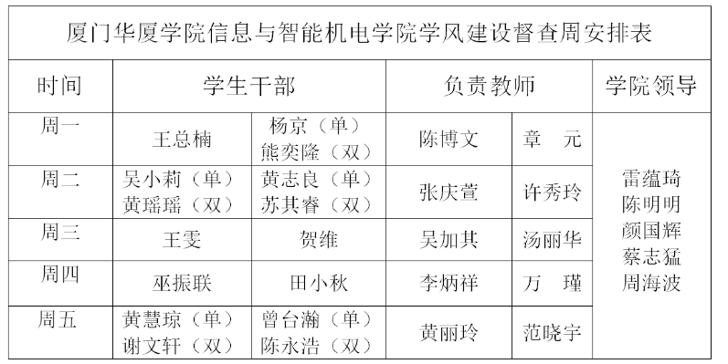 公司成立学风建设督查组,成员由院系领导、辅导员、员工干部组成,重点督查员工出勤、课堂秩序、带早餐进教室等情况,督导组成员及分工如下: