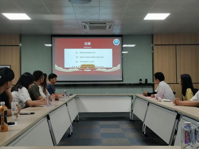 本次会议由宣传部部长王伟杰同学主讲。会议开始,他分别从编纂民法典的重大意义、民法典编纂工作情况、编纂民法典的总体要求和基本原则以及民法典草案的主要内容这四个方面为大家讲述。