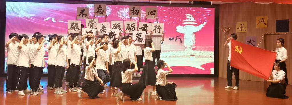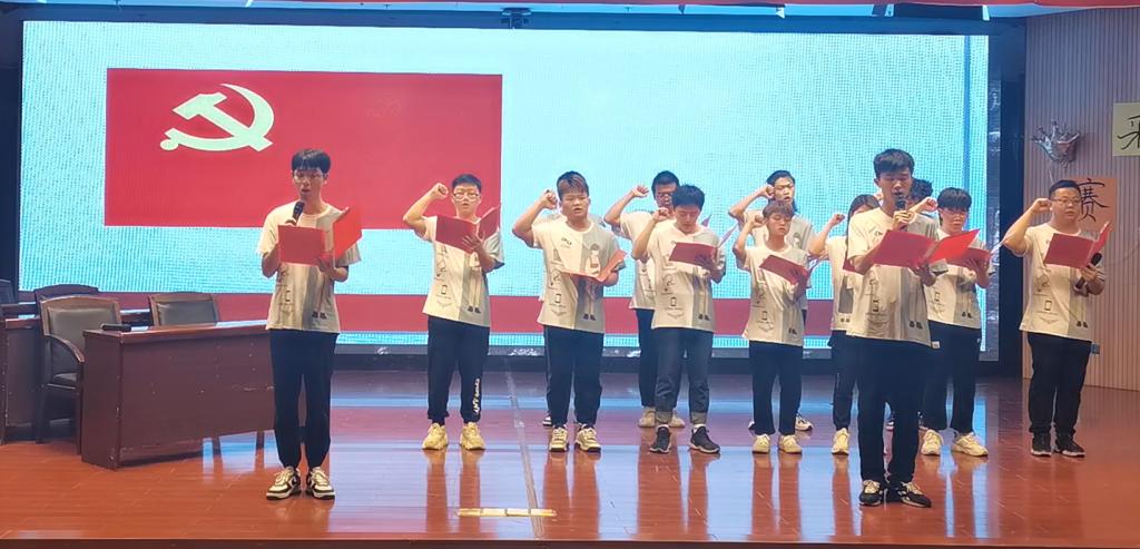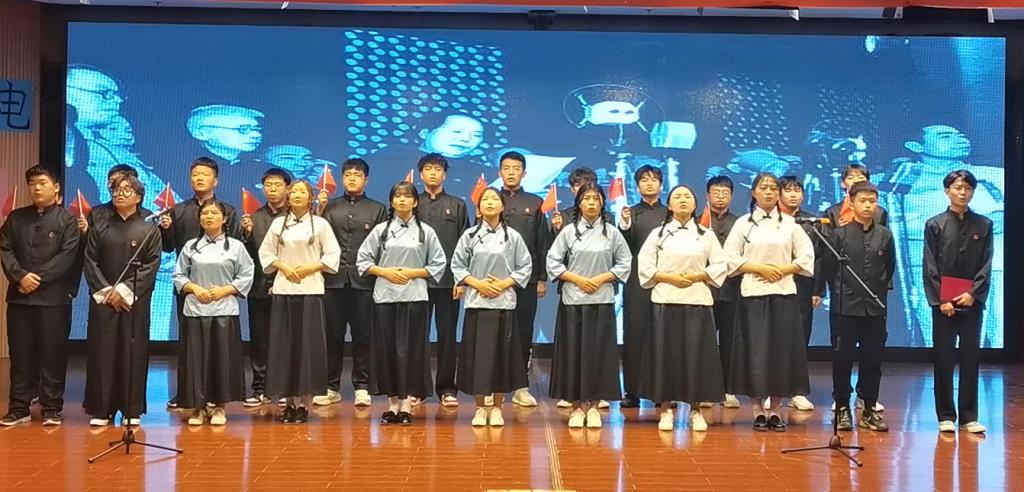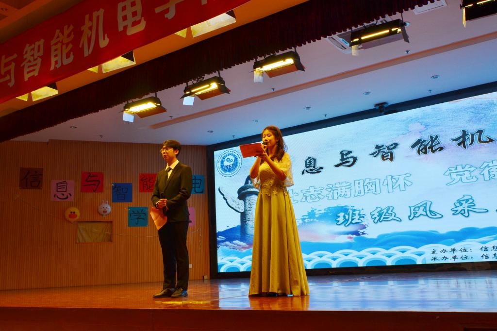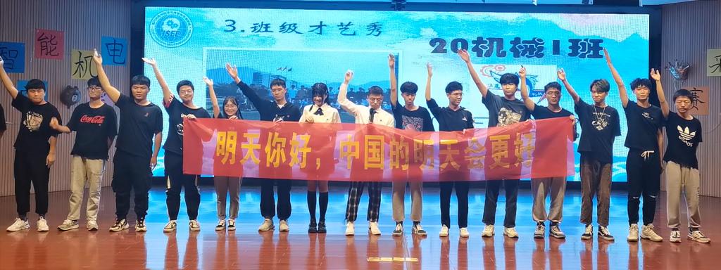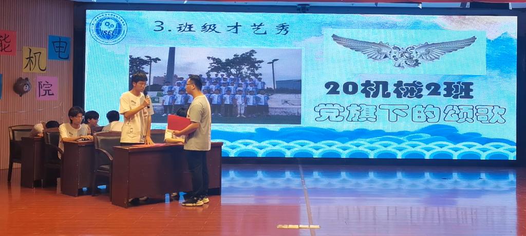首先出场的是20机械2班,他们用视频《我们的生活》和《学机械的生活》展现出人生因梦想绚丽多彩,生活因微笑充满阳光的场景,接着他们再现同学们日常上课时的样貌,让人身临其境。并以“家国梦”的咏叹诵读出一首荡气回肠的《党旗下的颂歌》。