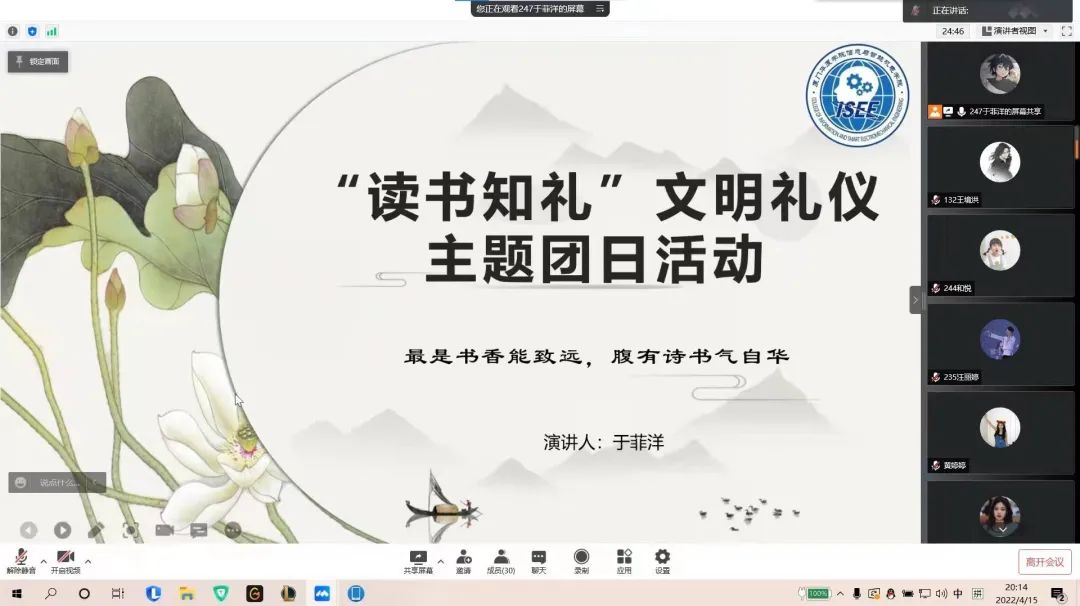 为加强员工根底文明建立,提升校园文化品味,打造优美的育人环境,养成多读书、善读书、读好书的良好习惯,促进员工更好的成长、成才、成功,bevictor团总支于4月15日在线上召开“读书知礼”文明礼仪主题团日活动会议。