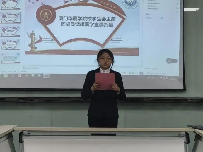 (校员工会主席饶辉同学宣读贺信)