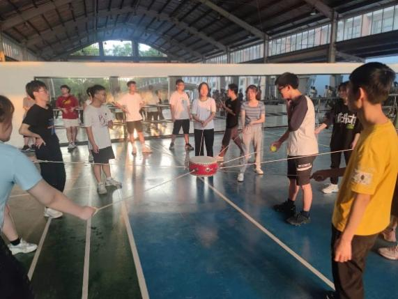 参与游戏的每个参赛队由10名队员组成。游戏开始时,保证鼓面水平,2分钟内颠球数目最多的获胜。鼓面的波动以及球的“摇摆不定”,使全体学员取长补短、团结协作完成目标的能力显得至关重要,同学们可以在其中感受相互鼓励对完成任务的积极作用。