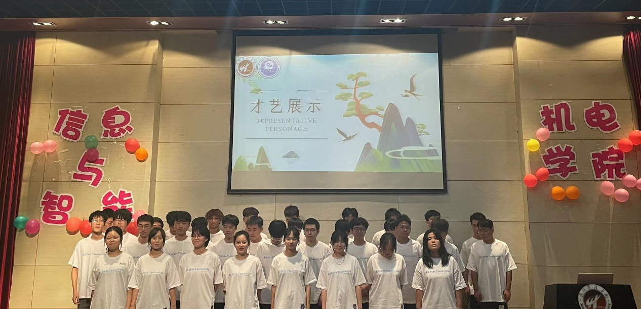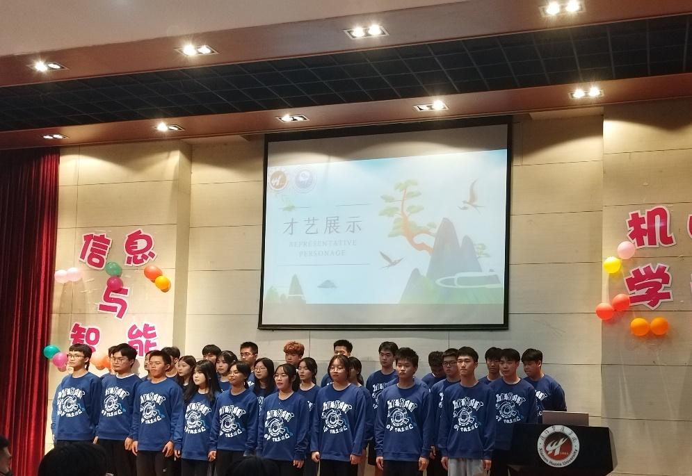 班徽加入了大数据常用的编程语言进行修饰。班服背面的图案添加了卡通形象,展示了大数据1班对美好生活的向往和童趣的一面!接着,他们用合唱《奇迹在线》的方式带动了全场气氛,表演欢快,充满了青春的活力!
