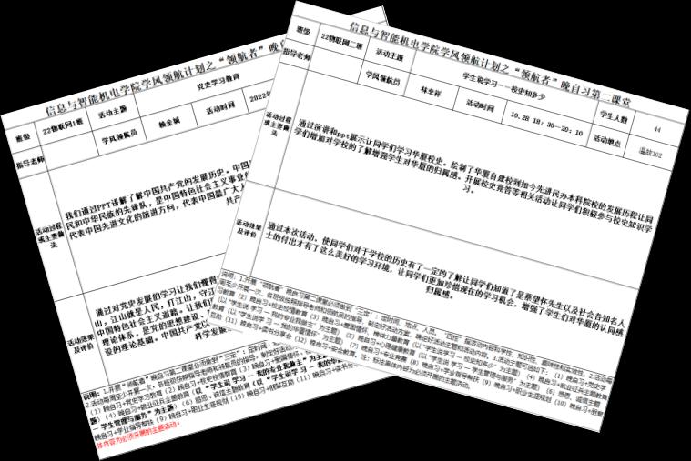 22通信1班和22通信2班分别开展了“员工说学习— 校史知多少”和爱国情怀、榜样力量主题活动。绝大部分同学能利用晚间时间进行课后作业及项目实践,课堂氛围良好。