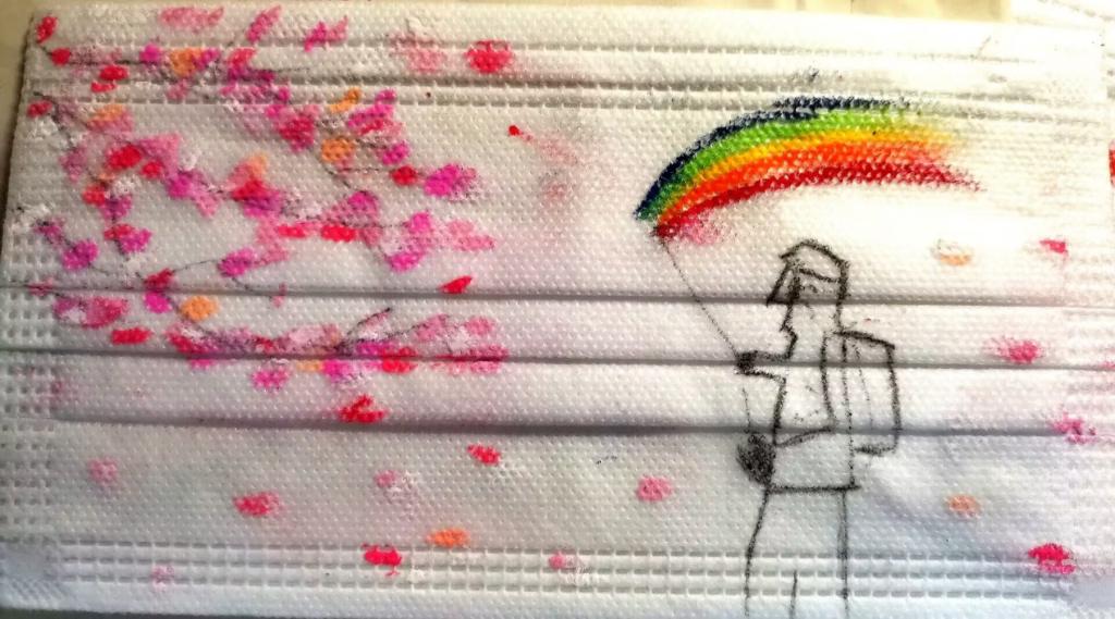 设计理念:口罩设计中,作品的灵感来源于医护人员在校园中对公司各处消毒的场景,正是伟德体育所种植的三角梅带来花儿落叶的感觉,医护人员的消毒工具中喷出的药物不仅仅是药物,是雨后彩虹,为我们的疫情默默付出点赞!付出也表达我对医务人员的敬意!