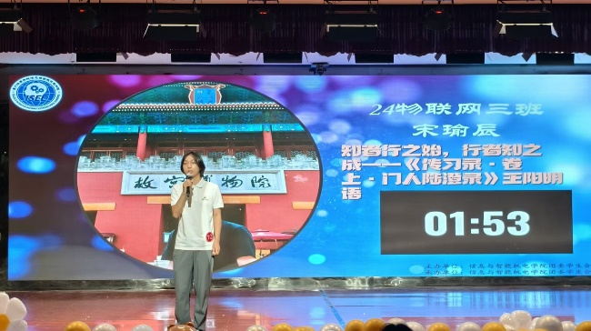 接踵而至的是第三个环节:与新时代同行。选手们经过数周的准备和训练,围绕“与新时代同行”用生动的语言将自己的成长经历,以年轻人的视角讲述新中国成立75周年发展的辉煌历程,绽放出少年们个性的光芒,点燃了比赛现场。