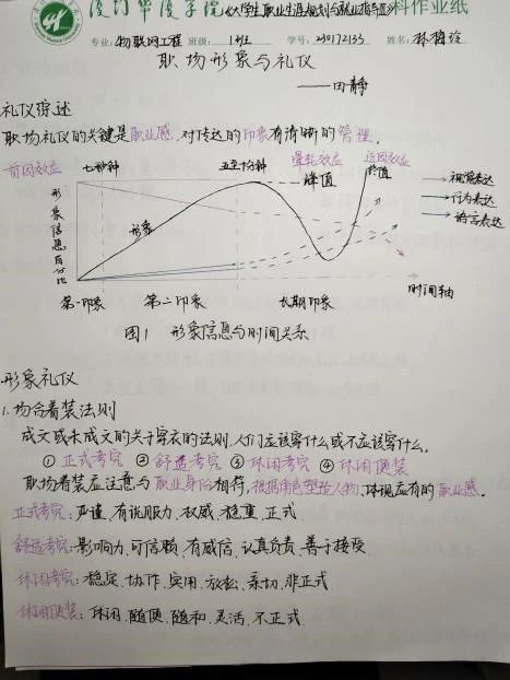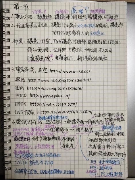 林梅玲同学笔记内容涵盖了摄影行业的多个方面,包括职业介绍、行业前景、审美养成以及软件使用技巧。字体工整,重要概念和关键点使用了不同颜色的笔进行标记,如蓝色和紫色,使得重点内容一目了然。