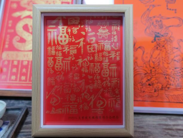 颜朝俊老师向我们介绍了漳州木版年画的基本制作过程,主要包括描稿、刻版、分色、套印等步骤。他向实践队员认真介绍了木版画的木版制作流程,纸张放置的流程与注意事项,毛刷的材质和刷墨时的手法与方向,取下作品时的方向与力度。随后,在颜朝俊老师的展示与指导下,实践队员纷纷拿起刷子,制作出一份份独一无二的木版画《福》,并一同录制了祝福视频。