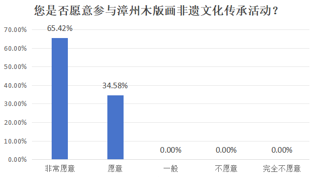 实践队分析所有的调查数据发现:65.42%的民众非常愿意参与漳州木版年画非遗文化传承,34.58%的民众愿意参与漳州木版年画非遗文化传承。这反映了公众对非遗文化的高度关注和传承责任的高度重视。