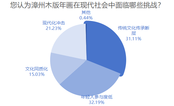 漳州木版画作为一项非遗文化,在现代社会中面临的挑战,31.11%的民众认为是传统文化传承断层,32.19%的民众认为是年轻人参与度低,15.03%的民众认为是文化同质化,21.23%的民众认为是现代化冲击,0.44%的民众认为是其他原因。