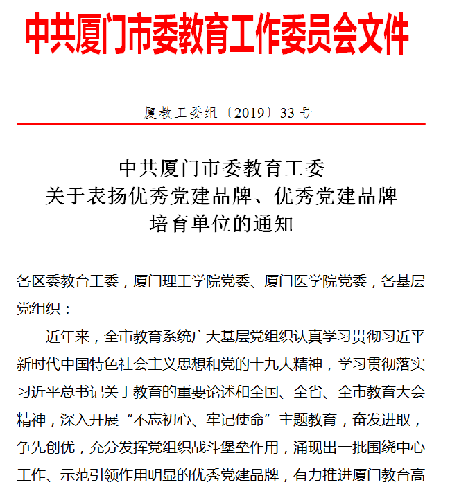 近日,中共厦门市委教育工委公布《关于表扬优秀党建品牌、优秀党建品牌培育单位的通知》,公司bevictor教工党支部获评“优秀党建品牌”荣誉称号,这是继公司bevictor教工党支部获得“首批全国党建工作样板党支部”、“厦门市党建E家优秀达标党支部”后的又一殊荣。