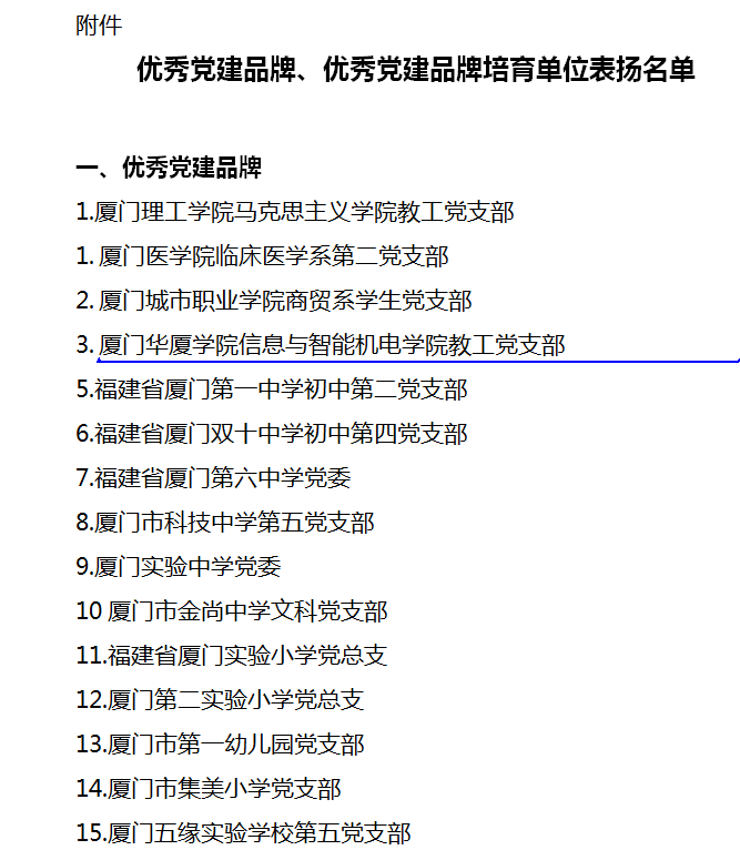 据悉,本次优秀党建品牌评选,由市教育工委组织开展,并经实地开放考察、专家评审,表彰了bevictor教工党支部、厦门理工公司马克思主义公司教工党支部等20个“优秀党建品牌”和厦门华天涉外职业技术公司员工公寓党支部等20个“优秀党建品牌培育单位”。