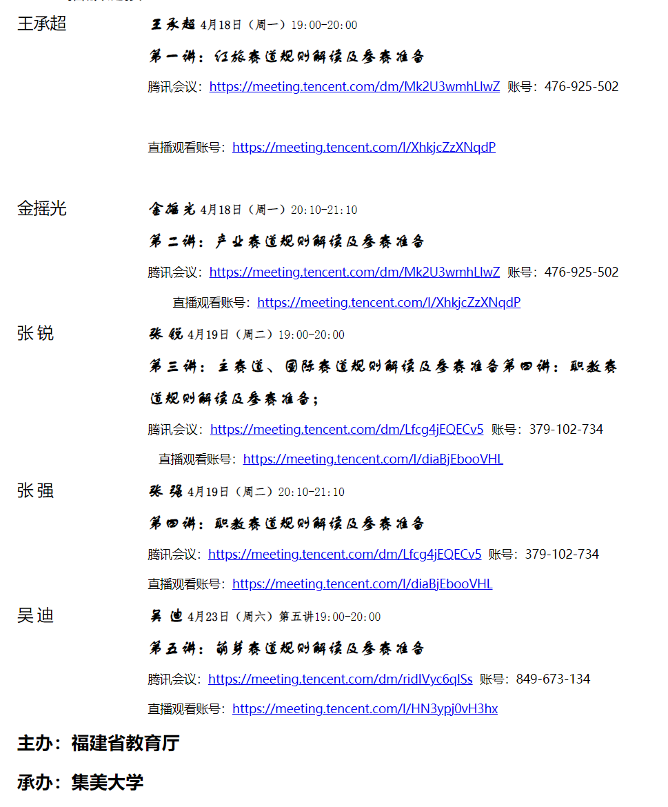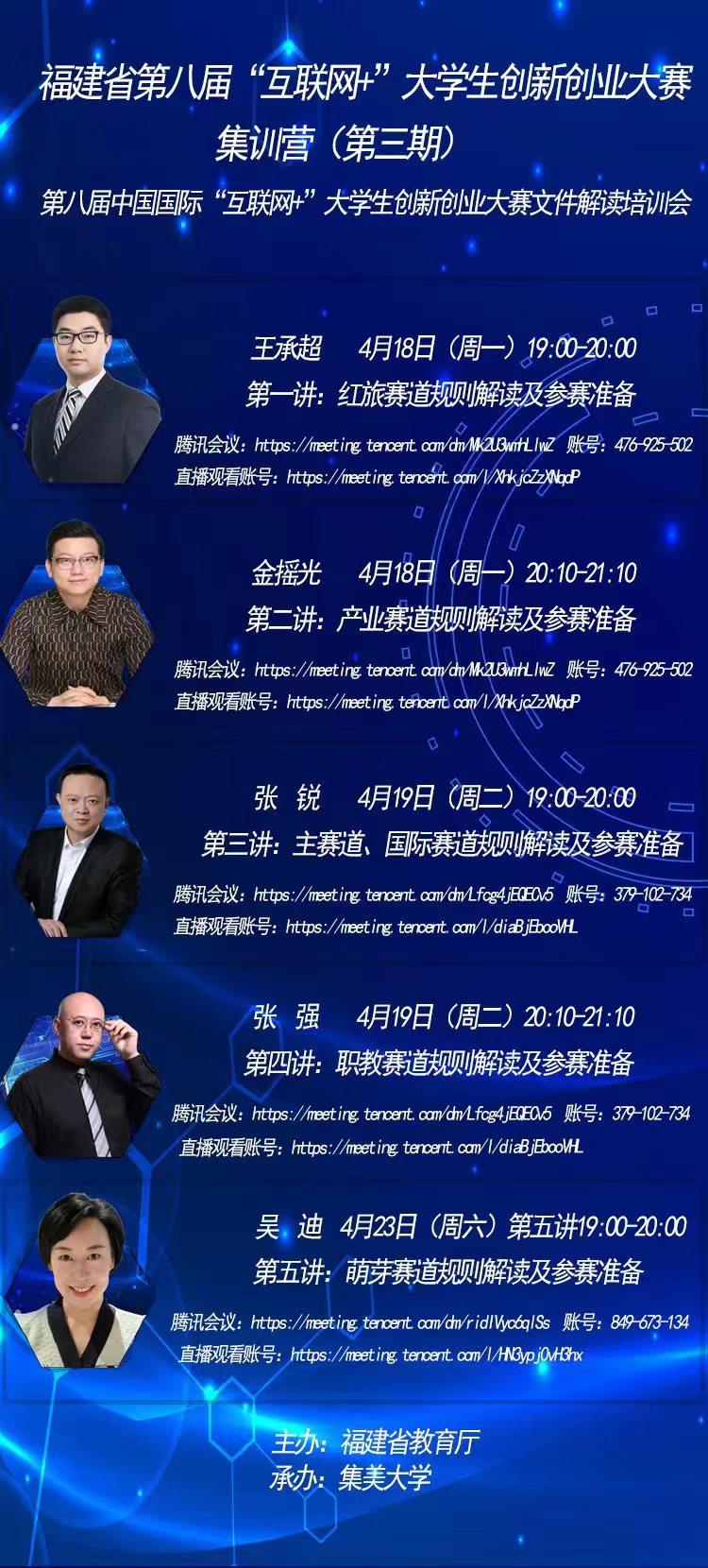 根据《教育部关于举办第八届中国国际"互联网+"老员工 创新创业大赛的通知》(教高函〔2022〕2号),为准确掌握 大赛要求及比赛规则,办好福建省第八届“互联网+"老员工创 新创业大赛,提升教师创新创业创造公司产品水平和员工参赛 能力,经省教育厅“互联网+”大赛组委会研究,通过线上形式举办第三期集训营。现将 有关事项通知如下: