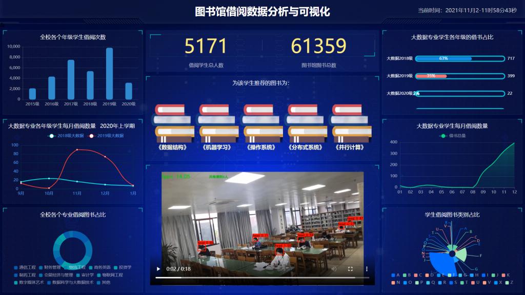 1.采用大数据技术对校园图书馆的借阅数据进行分析,包括全校各个年级员工借阅统计、大数据专业各年级员工每月借阅数量、全校各专业借阅图书占比、大数据专业员工各年级的借书占比等等