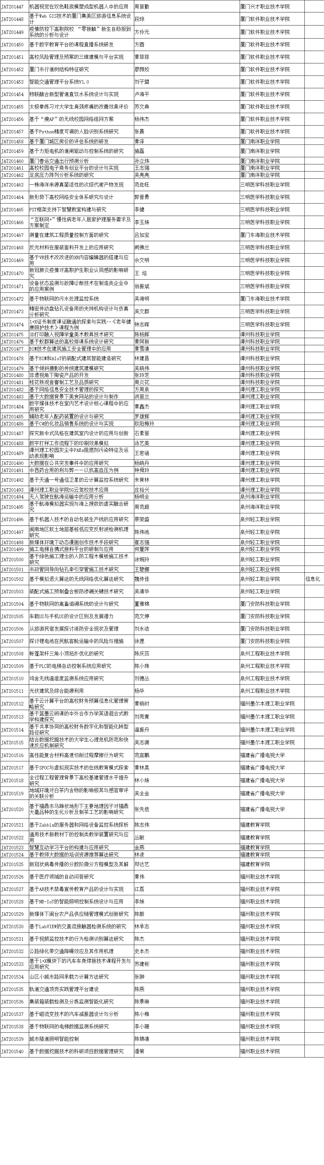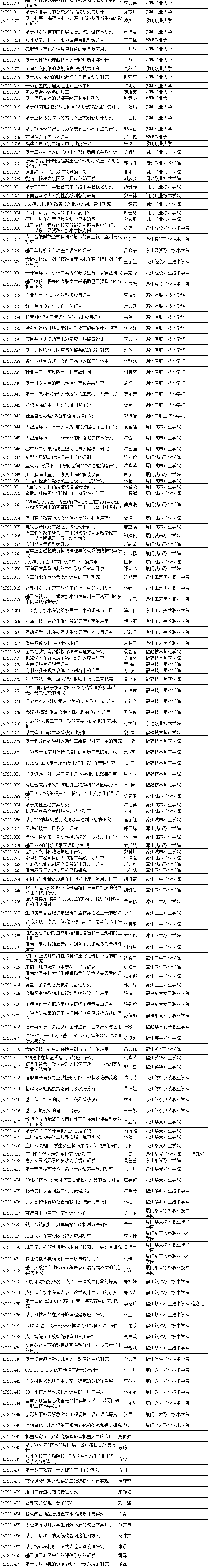 根据《福建省教育厅关于做好2020年度中青年教师教育科研项目(科技类)申报立项工作的通知》(闽教科〔2020〕15号),在申报单位评审推荐的基础上,经审核研究,确定2020年福建省中青年教师教育科研项目(科技类)立项项目(含信息化专项)1540项。现将立项名单予以公布。
