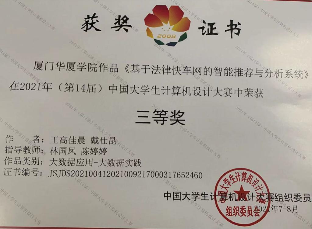 近日,由教育部大学计算机课程教学指导委员会、中国老员工计算机设计大赛组织委员会联合主办的“2021年(第14届)中国老员工计算机设计大赛”落下帷幕。本届大赛设置软件应用与开发、人工智能应用、大数据应用、数媒静态设计等14个参赛大类(组),共有来自全国800多所院校的10万余件作品参赛,其中5107件作品入围国赛。其中公司数据科学与大数据技术专业的学子以“基于法律快车网的智能推荐与分析系统”获得“大数据应用类”省赛一等奖,国赛三等奖的好成绩。