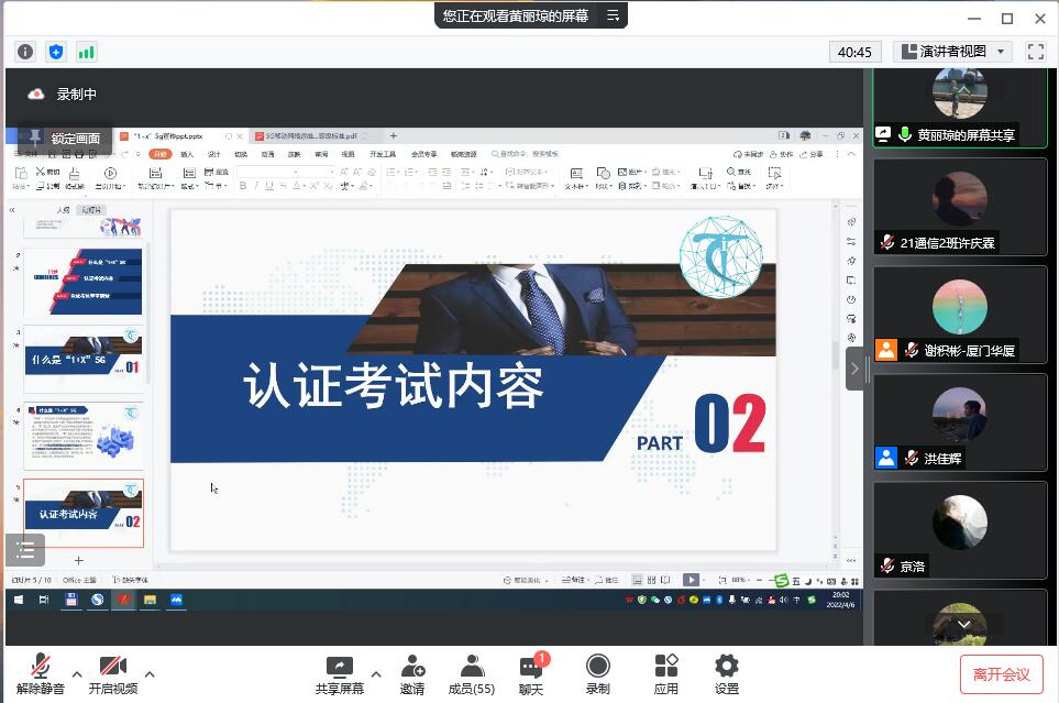2022年4月6日晚上20:00于腾讯会议开展“1+X”5G认证考试线上宣讲会,本次会议由ICT协会指导老师黄丽琼、谢积彬主持,参加本次会议的成员为对该认证考试感兴趣的公司19、20级员工。