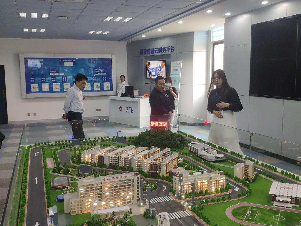 本次活动由员工讲解员向各位莅临的校企领导和嘉宾具体阐述ICT产教融合创新基地。其中包括VR体验,虚拟厦门华厦ICT校庆活动特辑演播厅,微课演示,5G基站模型,探索ICT,智慧联通系统沙盘等六部分。通过本次参观,领导们对ICT产教融合创新基地和ICT协会有了更清楚的了解,并且给予了极高的肯定。