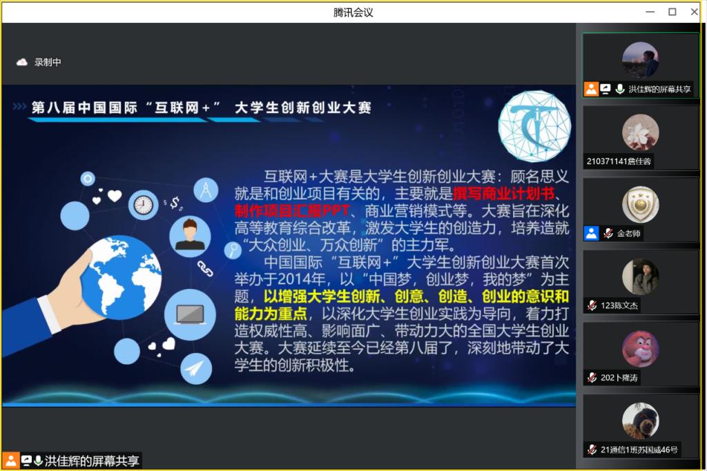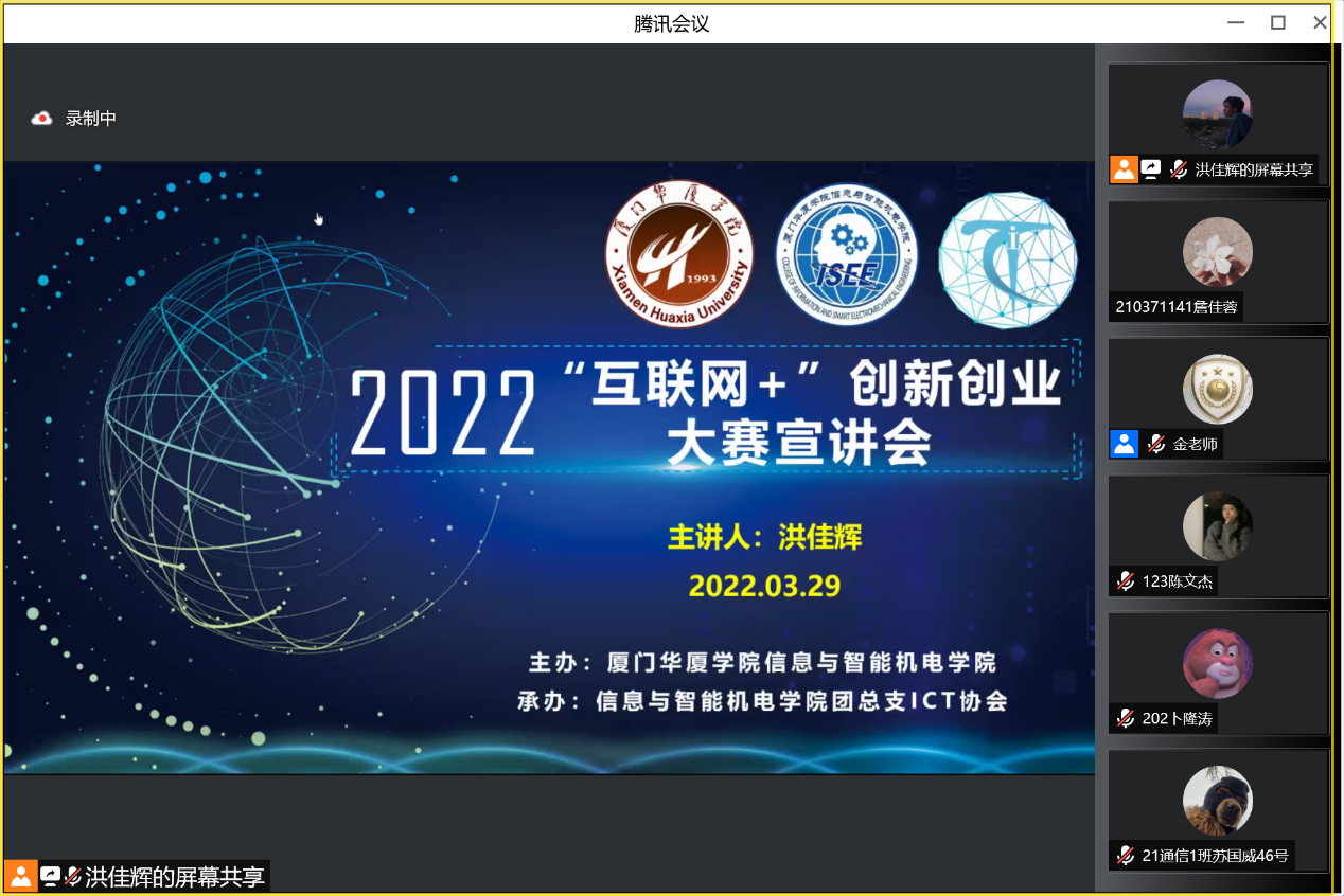 2022年3月29日下午15:00,由bevictor主办、bevictor团总支ICT协会承办的 “互联网+”大赛宣讲会在线上顺利开展。此次会议主要由ICT协会副会长骆娇娇主持、会长洪佳辉主讲,同时出席本次会议的有金鑫老师,以及对大赛感兴趣的通信工程和物联网工程专业的同学们。