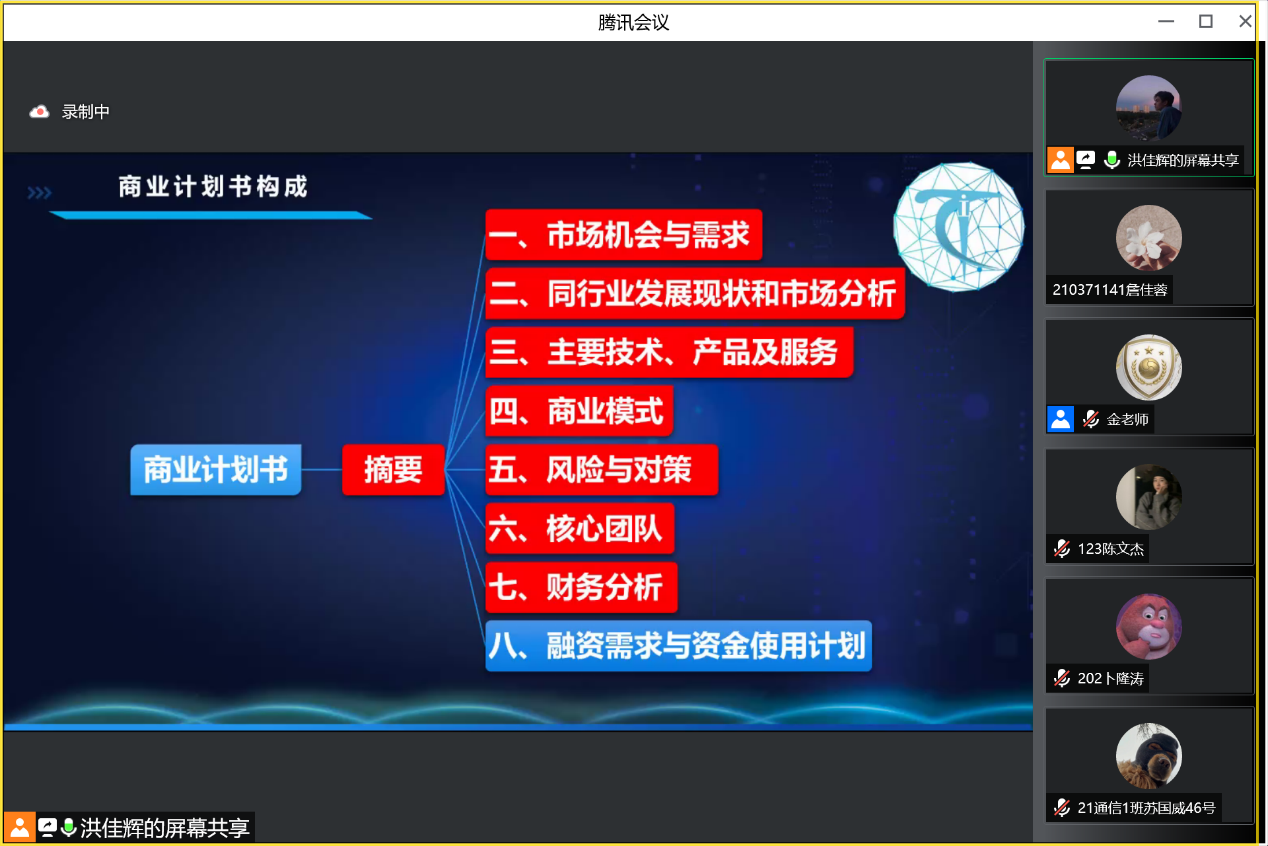 会议伊始,由主持人骆娇娇同学对创业创新于国家、个人的重要性和地位做了大致的描述,紧接着由主讲人洪佳辉同学对“互联网+”展开详细的讲解。此次会议主要围绕双创的内容、参加双创的意义和商业计划书的撰写展开。主讲人通过双创的介绍进而对三创、大创的内容进行了拓展和补充,为与会成员展示了历届大赛的剪辑视频,向学员们展现了莘莘学子在创新创业上取得的成就和他们勇于开拓创新的精神。同时主讲人对参加双创的意义和商业计划书的要点进行了详细的说明,并在最后对学员们对双创赛的疑问做了详尽的解答,还建立了相关的答疑群为后续的疑问解惑。参加此次会议的学员们都对本次宣讲的内容进行了认真地记录和总结。