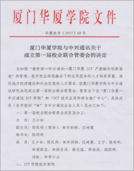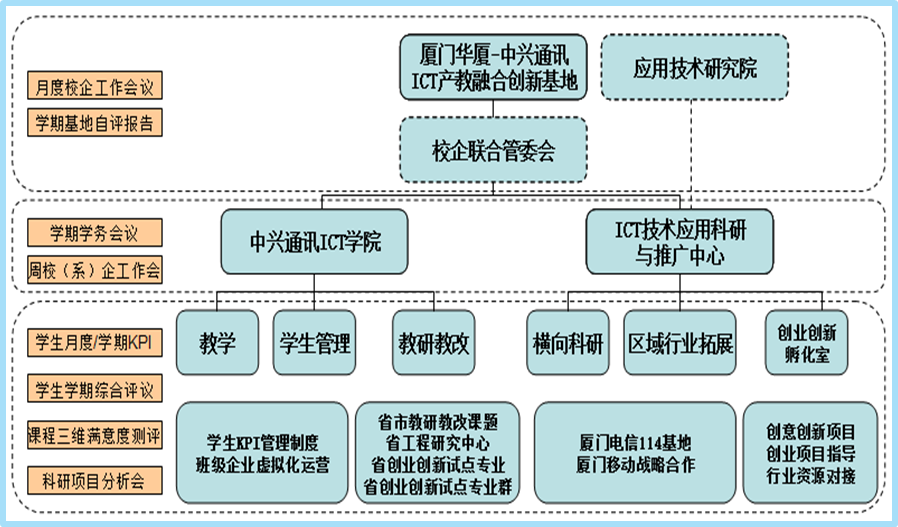 “教育部--厦门华厦ICT产教融合创新基地”积极探索“校企联动、互促共赢、全程共建”的ICT产教融合创新模式,伟德体育与中兴通讯成立专门的领导小组负责领导基地的建设工作,同时共同成立“ICT产教融合创新基地管理委员会”,规范、监督与指导合作基地工作。