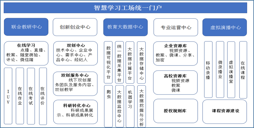 基地已经完成建设ICT 2.0智慧学习工场,构建互联网+智慧学习平台,建设虚拟演播中心、专业运营中心、联合教研中心、创新创业中心、教育大数据中心等五大中心,线上线下智慧学习环境,并改变单一的从公司层面发起教育信息化的惯性模式,创造性地从专业、学习、教研层面,开展互联网+教育的创新与实践。