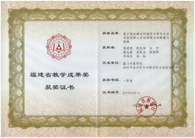 《基于校企融合的通信工程专业应用型创新人才培养模式的构建与实践》获评福建省本科教学成果一等奖;基地产教融合成果作为典型案例在《教育之弦》发表推广;2016年、2017年连续两年,在“‘一带一路’产教融合与企业国际化发展论坛”分享公司校企合作产教融合建设经验,获得行业专家高度认可。