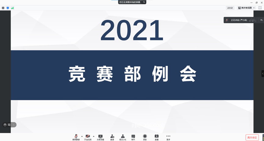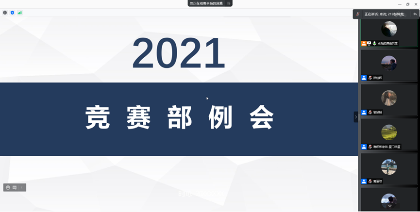 2021年9月18日下午14:00于腾讯会议,线上开展了竞赛部工作跟进会,本次会议由竞赛部部长卓尧主持,参加本次会议的有竞赛部指导老师谢积彬老师和黄丽琼老师、会长洪佳辉、副会长骆娇娇以及竞赛部全体成员。