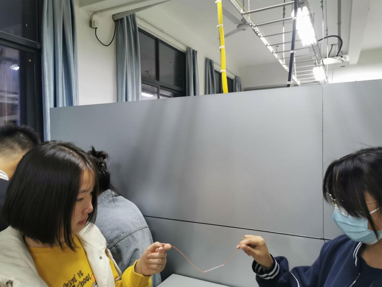 接着,同学们在会长的教学下开始动手实践,第一步使用米勒钳剥除光纤涂覆层,第二步用酒精棉清洁光纤表面,第三步使用切割机对光纤进行进一步的加工,最后使用熔接机对俩根光纤进行最后的熔接。在实践的过程中,干事们互相帮助共同熔接光纤,过程其乐融融,虽然有失败也有成功,但他们收获了属于自己的果实。