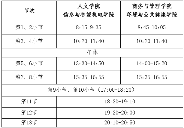 根据疫情防控要求,员工恢复线下教学后,实行不同公司错峰上课。第一大节课程上课时间不同公司分别为8:15、8:45;第二大节课程上课时间均为10:20;第三大节课程上课时间不同公司分别调整为13:30、14:00;第四大节课程上课时间均为15:35;每一大节(两小节)课程上课时间调整为80分钟。具体如下表: