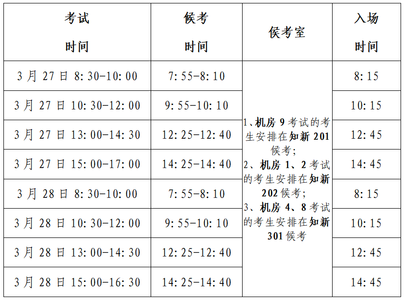 请考生务必严格按照上述时间安排候考及入场。若考生因未按要求,造成无法如期参加考试,后果由考生自负。