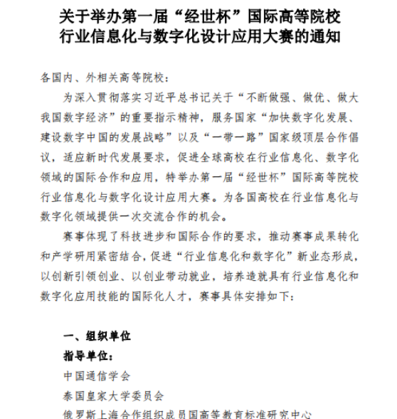 本次比赛深入贯彻落实习近平总书记关于“不断做强、做优、做大我国数字经济”的重要指示精神,服务国家“加快数字化发展、建设数字中国的发展战略”以及“一带一路”国家级顶层合作倡议,适应新时代发展要求,促进全球高校在行业信息化、数字化领域的国际合作和应用。在中国通信学会、泰国皇家大学委员会和俄罗斯上海合作组织成员国高等教育标准研究中心的指导下,特举办第一届“经世杯”国际高等院校行业信息化与数字化设计应用大赛。为各国高校在行业信息化与数字化领域提供一次交流合作的机会。本次大赛共吸引了国内外共 58 所公司、91 支队伍参赛。