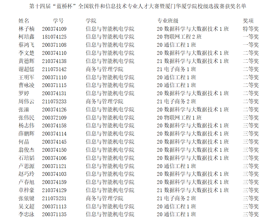 经过系统评分和审查,确定评出特等奖1项,一等奖2项,二等奖8项,三等奖13项。现将获奖名单予以公布。公司将从其中获奖同学中选派成绩优异的同学共同参加2023年4月举行的“蓝桥杯”省赛。