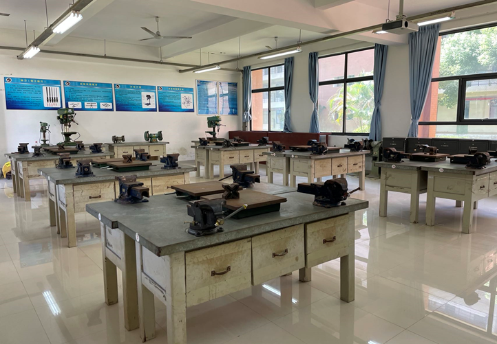 钳工实训室于2007年建设。实验室主要有24个钳工工位、钻攻机、台式钻床、砂轮机以及若干金工实训的工具、刃具、量具等,能满足包括锉削、锯切、划线、钻削、铰削、攻丝和套丝、研磨、矫正、弯曲等基本操作。通过训练,使员工掌握钳工的基本操作技能;正确熟练地使用有关工具、量具、刃具、夹具等;做到安全生产、文明生产、操作规范。主要支撑课程是《金工实训》;主要实验实训项目:锯、锉圆柱体实训、凹凸配合件加工实训、台阶孔钻削实训、榔头制作加工实训、六角螺母制作实训等。