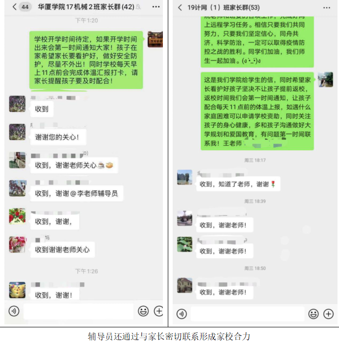 “同学们,今天你在“华厦健康日报告”了吗?”这一句问候语连结了辅导员和员工彼此间的牵挂。在抗“疫”的严峻时刻,辅导员每天都通过网络与员工谈心,领着员工骨干连线作战,在各班级组建抗“疫”心灵驿站中,每天都能看到他们的消息:一条条疫情防控知识、一句句暖心问候、一张张激励人心的图片,汇聚着辅导员们对员工们的关爱。辅导员们每天都在手机上收消息、发通知,在电脑上统信息、报数据,同时要组织谈话,开展文化活动。虽身在家中,一点也不比上班轻松,
