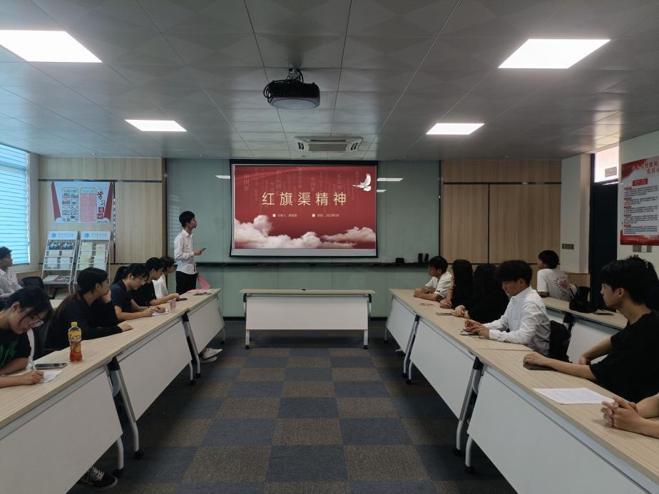 此次活动由党员黄俊贤分享关于红旗渠精神的故事。首先主讲人介绍了关于红旗渠的建造,在林县遇到前所未有的干旱时,县内民工召集全县人民在极其艰难的条件下修建引水入林的水利工程。随后,主讲人详细介绍了红旗渠精神的内涵,红旗渠精神是“自力更生、艰苦创业、团结协作、无私奉献”的精神,是在修建红旗渠的过程中形成的,是劳动人民用双手在悬崖峭壁上创造的。在今天红旗渠不仅仅是一项水利工程,更是成为了民族精神的一个象征。最后黄俊贤同志号召在场的党员、入党积极分子在新时代要继承和发扬红旗渠精神,感悟其中蕴含的奋斗、为民的情怀,在未来要勇于创业、敢于创新,将其内化为精神追求,外化为干事创业的动力,把青春热血镌刻在历史丰碑上。